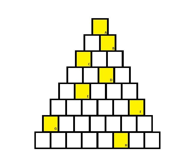 So, nun zum Cache: Nachfolgend seht ihr eine Pyramide, die mit Antworten aus den 8 darunter stehenden Fragen gefüllt werden muss. Beantwortet wird von oben nach unten. Die Zahlenwerte der Buchstaben in den gelb markierten Feldern müsst ihr in die Gleichung einsetzen und so die Zielkoordinaten berechnen.