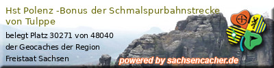 Danke für den Cache „Hst Polenz -Bonus der Schmalspurbahnstrecke“ (GC6B7N8) an „Tulppe“ vom Team Thomi 1669.