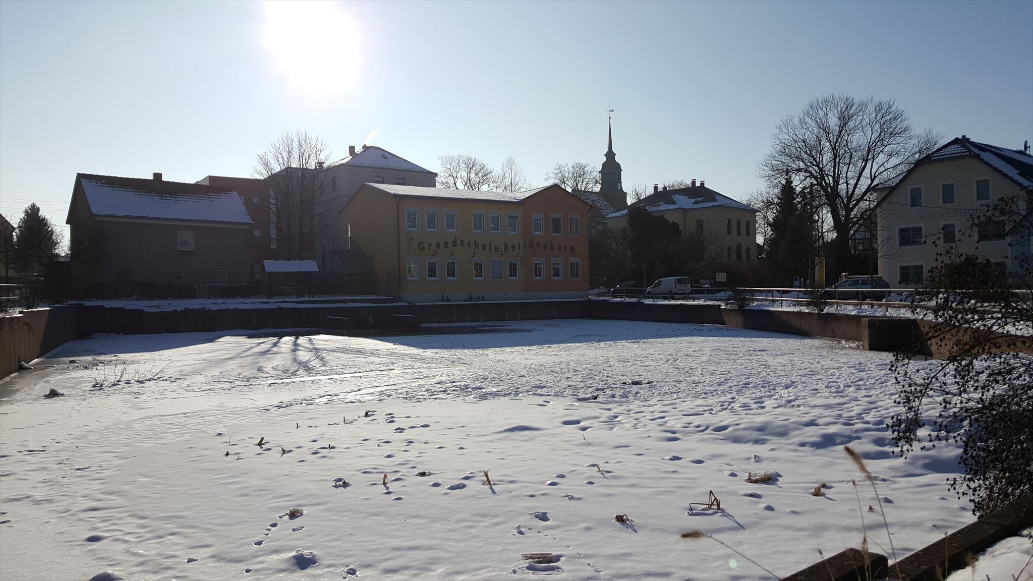 Dabei konnten wir noch den Blick über den Dorfanger schweifen lassen. Schule, Kirche, Teich und dazu das leise Froschkonzert im Hintergrund – ein richtig idyllisches Plätzchen mitten in Reichenberg. ???