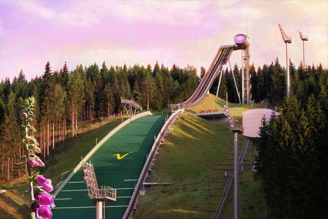 Unsere heutige Runde starteten wir an der Vogtlandarena. Am Morgen war die Schanze nicht zu sehen (aber zu hören, das war schon creepy). Am Abend bestand die Schwirigkeit darin, den Fuß hoch genug zu bekommen ??. Deshalb haben wir mittags zur Sicherheit noch ein Bild von ganz oben aufgenommen.