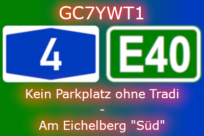 <a href="https://coord.info/GC7YWT1" target="_blank"> <img src="gs2604092012195944.jpg" height=267 width=400 alt="Kein Parkplatz ohne Tradi - Eichelberg „Süd“" /> </a> Add cache to watch list