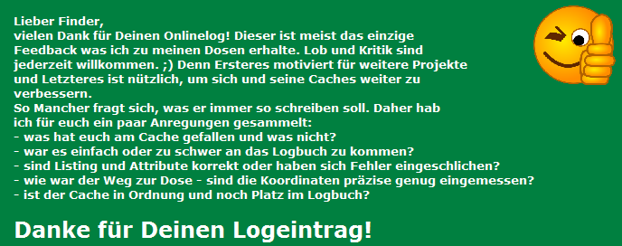 Sollte es Probleme geben - Logbuch voll/nass, Dose verschwunden, Dose oder Versteck beschädigt - meldet es bitte als Note oder im Log das entsprechende Problem mit anhaken!