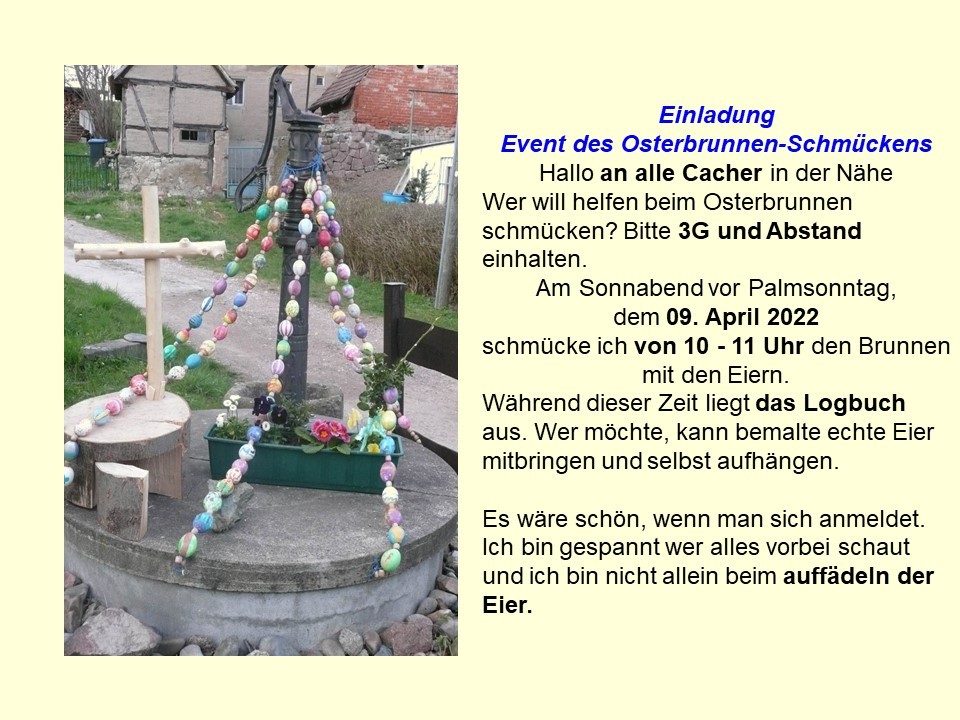 09.04.2022 Von Thomi1669 (Gefunden=3853 Versteckt=85, Stand: 09.04.2026) Das war mal eine sehr gut gelungene Aktion. Alle Beteiligten (vor allem aber wohl die Kinder) hatten viel Spaß beim Schmücken und das Ergebnis kann sich durchaus sehen lassen. Abseits davon konnten seit Langem mal wieder Fachgespräche geführt und auch wieder Gesichter zu Nicknamen zugeordnet werden, sehr schön