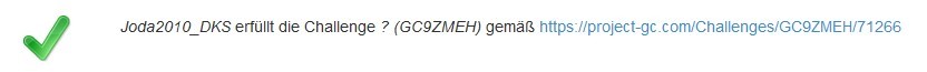 Wir sind mir dem Wohnmobil unterwegs und waren heute in der Nähe von Oschatz. Da stand die Reihe von Challengecaches auf den Plan. Die Aufgabe haben wir erfüllt und da können wir gleich loggen. Dankeschön fürs Legen und Pflegen sagen fannyRB aus Sachsen-Anhalt.