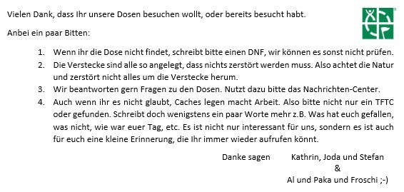 Ich sage Danke für die Belohnung, für's Verstecken und TFTC. Grüße aus dem Tharandter Wald, dem schönsten Wald Sachsen's.