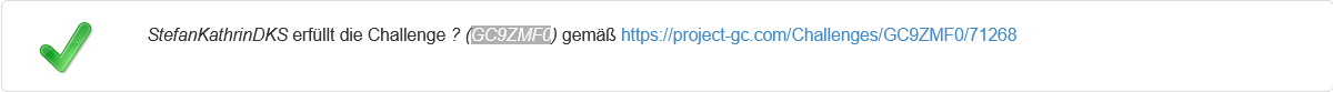 Wir sind mir dem Wohnmobil unterwegs und waren heute in der Nähe von Oschatz. Da stand die Reihe von Challengecaches auf den Plan. Die Aufgabe haben wir erfüllt und da können wir gleich loggen. Dankeschön fürs Legen und Pflegen sagen fannyRB aus Sachsen-Anhalt.