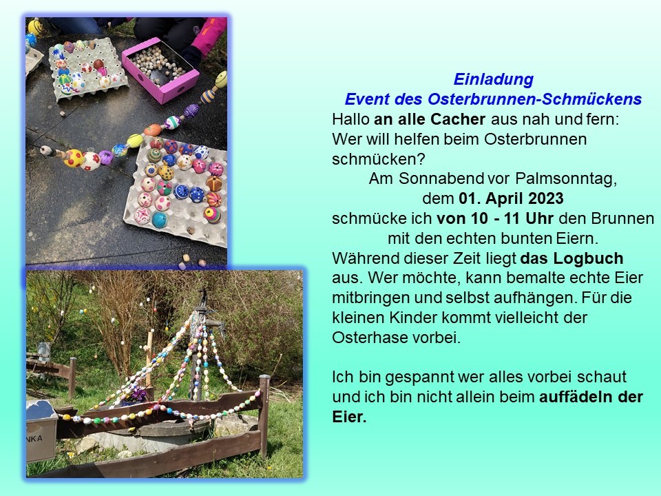 01.04.2023 Von Thomi1669 (Gefunden=3853 Versteckt=85, Stand: 09.04.2026) Auch in diesem Jahr war ich hier mit dabei. Offenbar hatten die Kollegen schon eher mit dem Schmücken angefangen, so dass ich zunächst zum neuen Tradi lief. Als ich dann nach einer Weile zurückkam, war alles fertig und leider nichts mehr zu helfen. Hatte ohnehin wenig Zeit, da noch ein privates Familienevent stattfand. War aber trotzdem wieder schön.