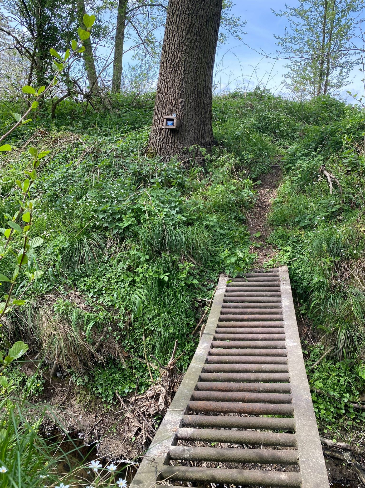 Der geheime Übergang war wirklich sehr geheim, dauerte eine Weile bis wir den entdeckt hatten. Also durch hüfthohe Brennesseln und Dornenranken gekämpft und dann 3 Schritte über das Bächlein balanciert. Hübsche Dose.