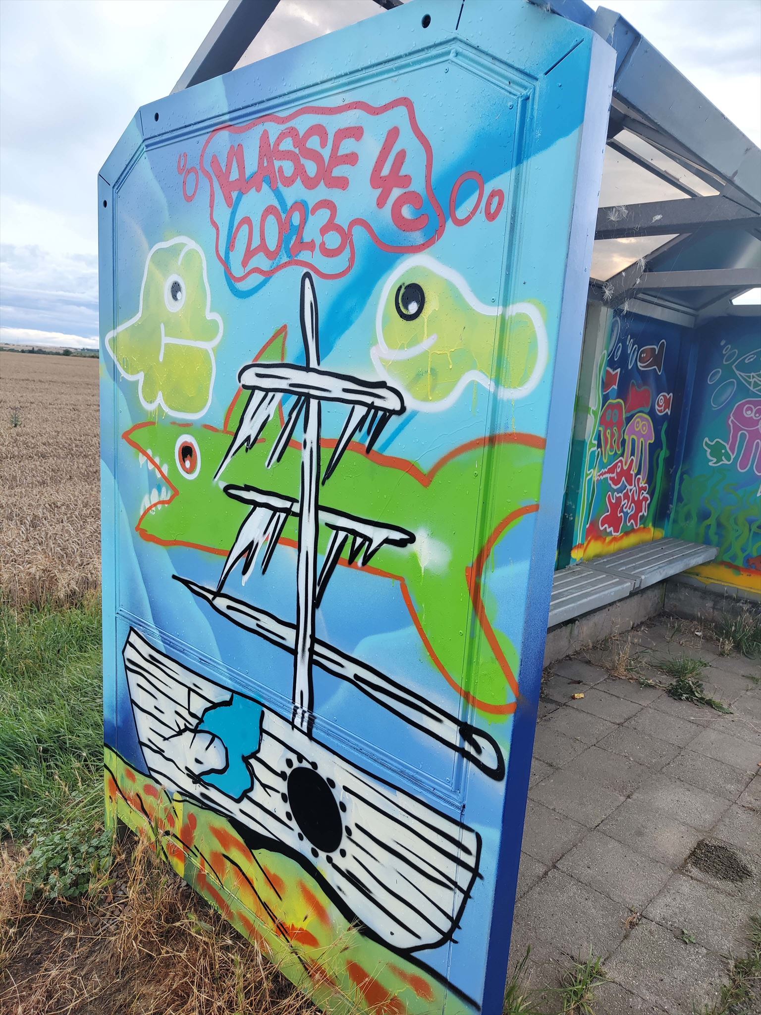 Schön, wie die Schüler der 4. Klassen das Wartehäuschen mit Graffiti gestaltet haben.