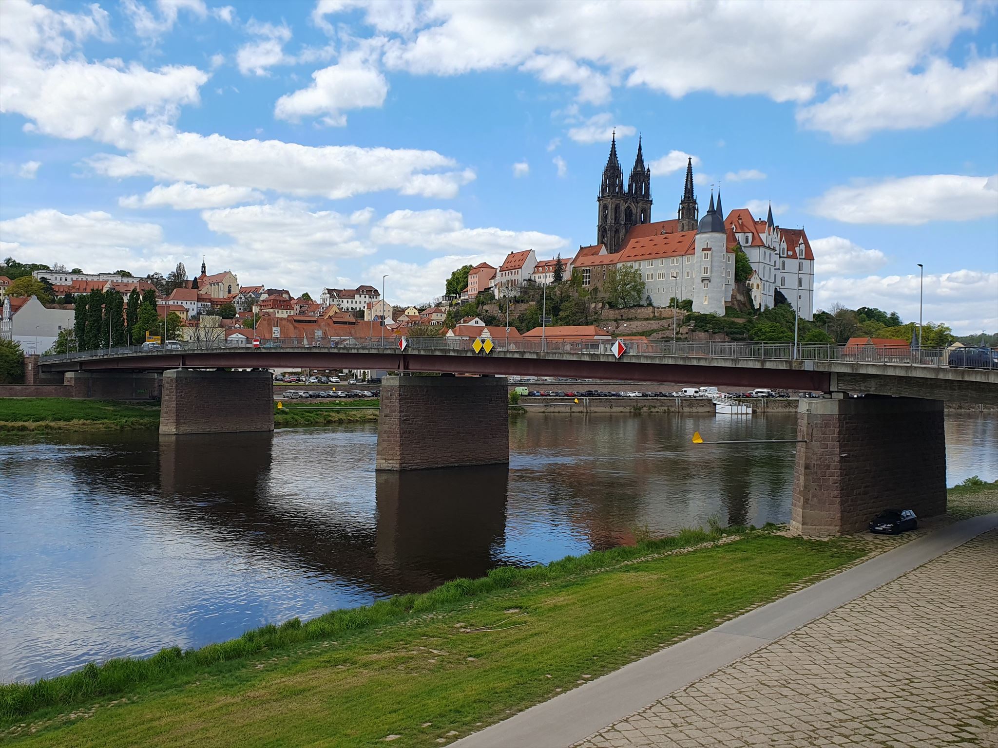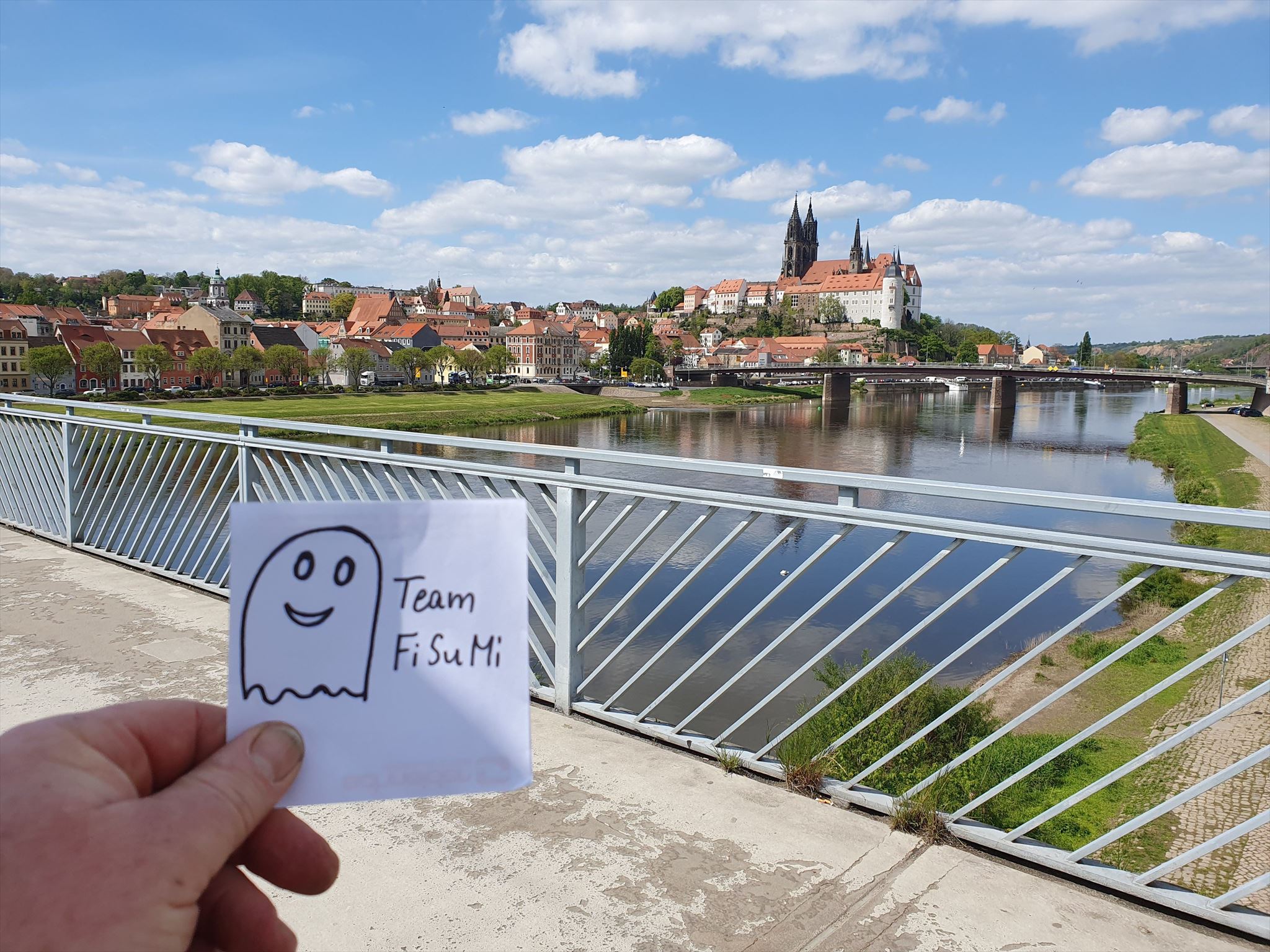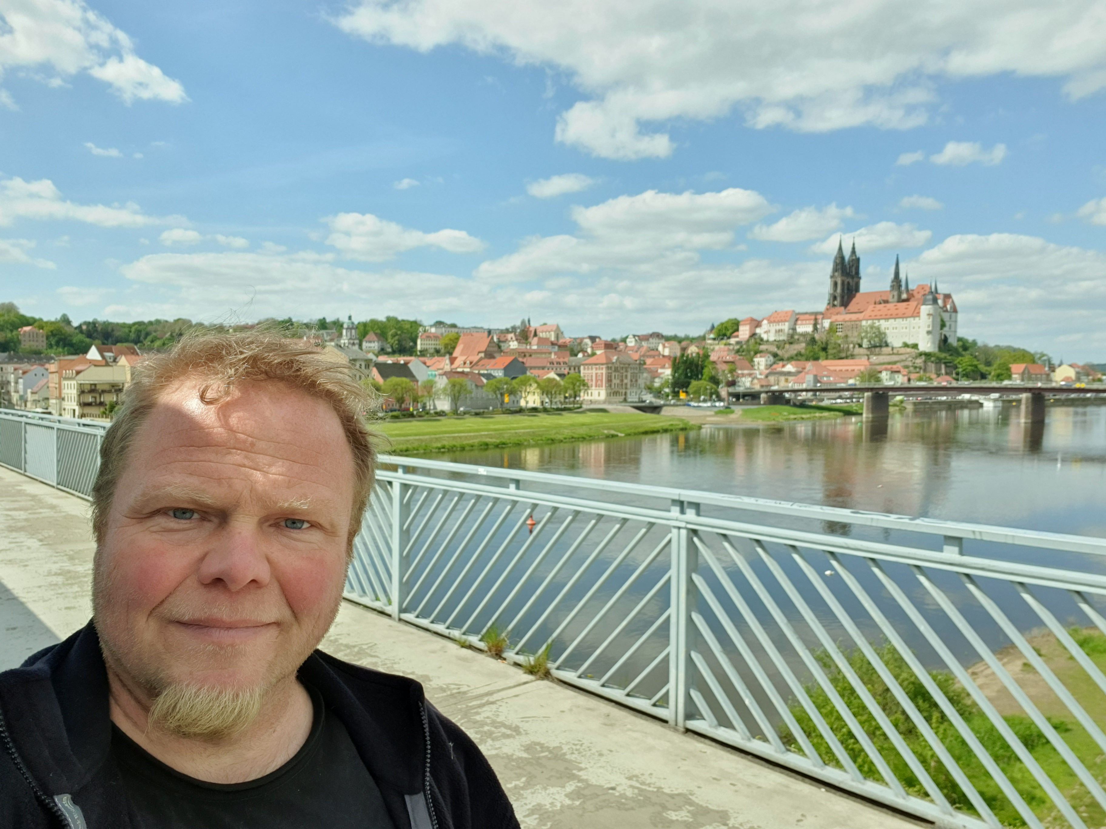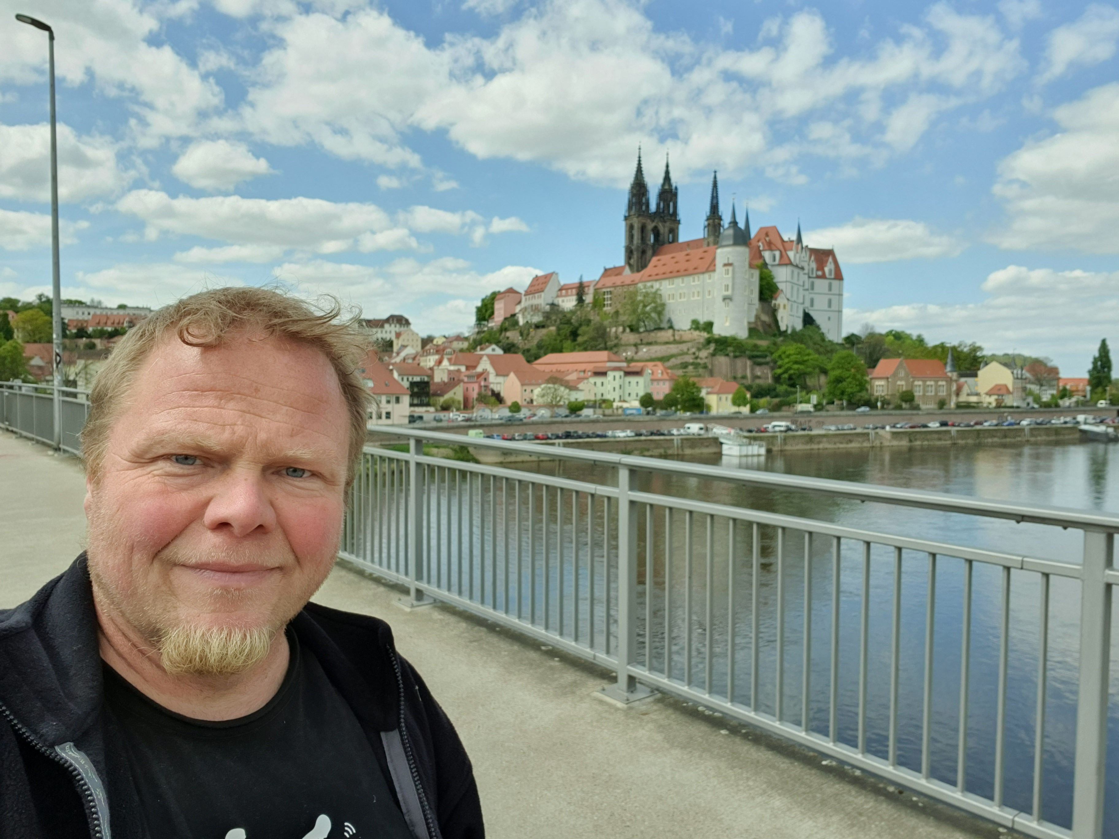 Mache ein Foto auf dem Fußweg jeder Brücke, welches dich oder einen unverwechselbaren Gegenstand im Vordergrund zeigt und im Hintergrund muß die Meißner Albrechtsburg zu erkennen sein. Hänge diese drei Fotos an deinen Log.