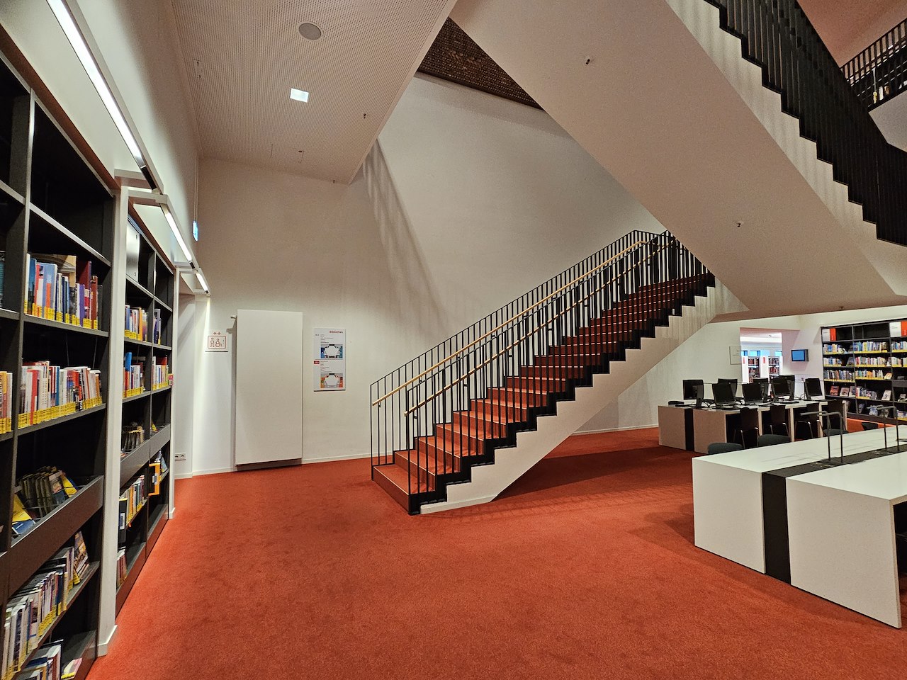 Lauft nun nach rechts in das Treppenhaus. Dort befindet sich neben mehreren Arbeitsplätzen auch die Reiseliteratur rund um Deutschland. Ein rundes Objekt zieht hier alle Blicke auf sich.