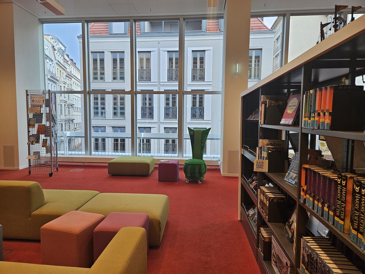 In the large seating area of the children's library, there are not only lots of stools and sofas, but also a very special armchair. The green reading throne can be found in almost every library in the municipal libraries and is very popular with reading mentors for reading aloud to kindergarten groups. It was sponsored by the largest Saxon daily newspaper. You will find its name on the cushion.