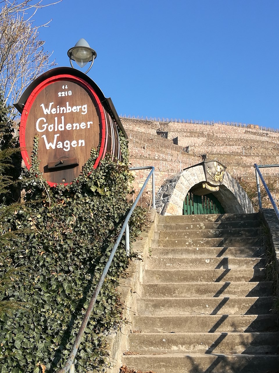 📝Die Entdeckung der Garten- und Rebenstadt Radebeul : Die SpitzhaustreppeStage 2 of 5 Sequence: Random Von Hoflößnitz geht es nun Richtung Spitzhaus weiter. Dabei erreicht man am Fuße der Spitzhaustreppe den wunderschönen Torbogen zum Weinberg "Goldener Wagen". Dieser Steillagenweinberg war einst in Kurfürstlich-königlichem Besitz. Heute gehört dieser Weinberg zum Sächsischen Staatsweingut Schloss Wackerbarth. Kurz danach erreicht man den Wegpunkt N51 06.778 E13 39.786. Hier findet man ein goldenes Schild mit der Information zur Jahrestreppe. Wie viele Stufen führen von hier nach oben zum Ende der Treppe. Ermittle die Zahl der Stufen und notiere sie.