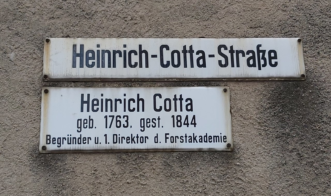 Als Kind eines thüringischen Forstmannes wurde er von seinem Vater forstlich ausgebildet. Er studierte in Jena Mathematik, Natur- und Kameralwissenschaften und begann anschließend mit Vermessungen und erteilte mit seinem Vater forstlichen Unterricht. 1801 wurde Cotta zum Mitglied des Forstkollegiums in Eisenach ernannt. Er verlegte mit der Berufung nach Sachsen, wegen der Nähe zum königlichen Hof in Dresden und des vielfältigen Naturraumes im Tharandter Wald, 1811 seine private forstliche Lehreinrichtung und Forstvermessungsanstalt aus dem thüringischen Zillbach nach Tharandt. Dadurch erhielt H. Cotta die Möglichkeit seine Lehren auf 150.000 Hektar Staatswald anzuwenden. 1816 wurde seine Lehranstalt zur Königl-Sächs Forstakademie erhoben. Besuchen wir -Forstlehranstalt von 1811 -Forstvermessungsanstalt 1811- 1852 -Cotta-Bau -Heinrich-Cotta-Straße -Cottas Grab (saisonal über 13 Drehen)