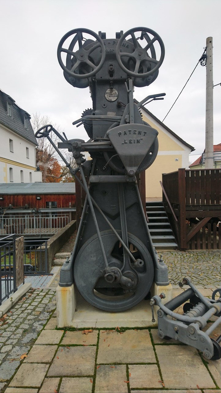 Vor der Mühle steht eine alte Holzbearbeitungsmaschine, welche ihr nun näher betrachten sollt.