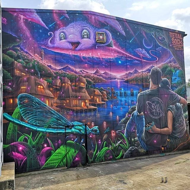 Wenn ihr von hier über Bahngleise schaut, seht ihr rechts vom Lidl eine Werkshalle, an der ein verliebtes Paar vor einer Fantasiewelt sitzt. Das sind Costwo und Lizzy, die 2018 geheiratet haben. Sie bekamen das Graffiti von den befreundeten Sprayern Tetal und Sock geschenkt.