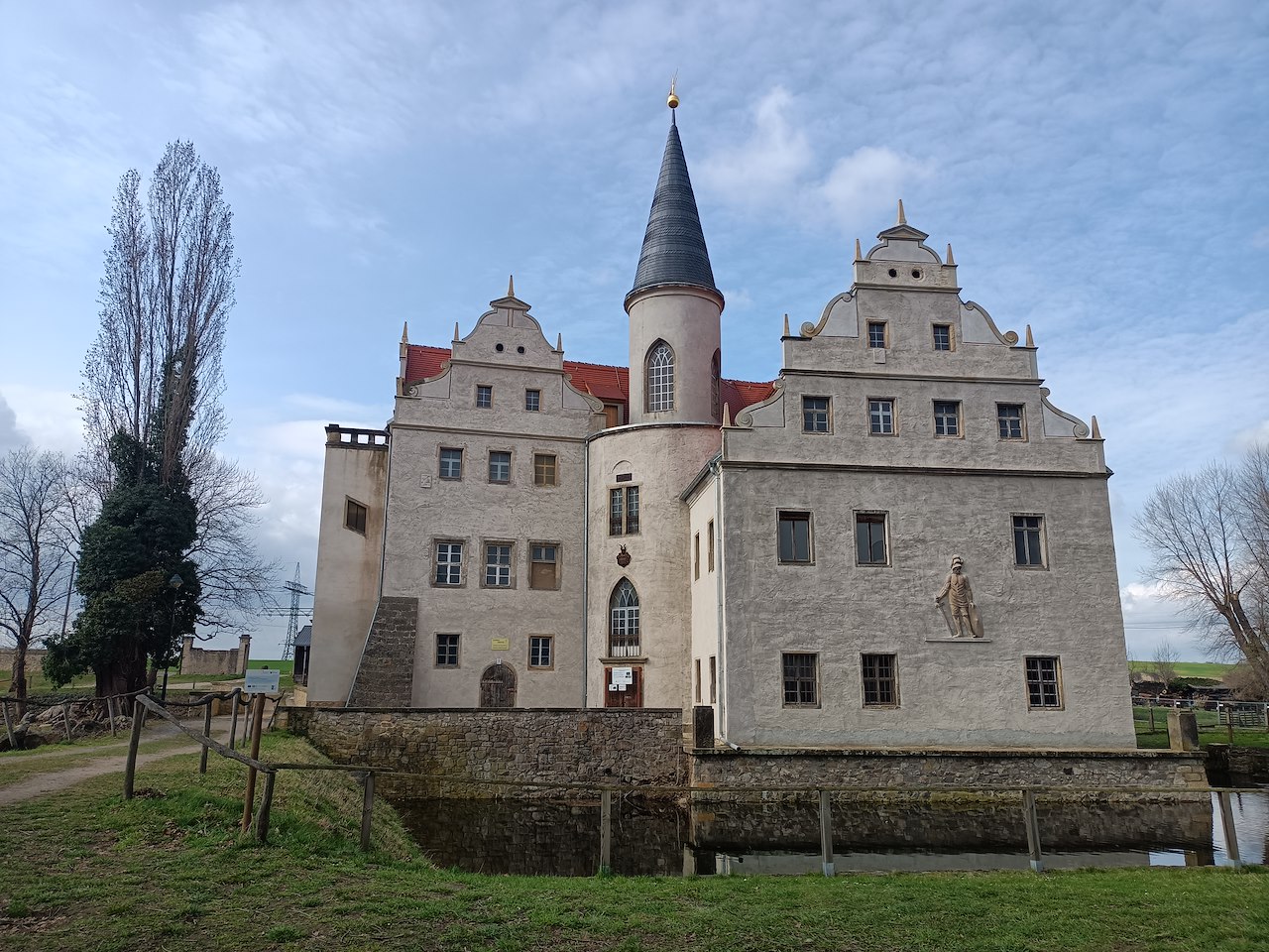 📝Das alteste erhaltene Wasserschloss Sachsens : Hauptansicht des SchlossesStage 1 of 5 Sequence: Random Hier stehen wir vor der Hauptfront des Wasserschlosses mit dem markanten schiefergedeckten spitzen Turm und wie es sich für ein Rittergut(-schloss) gehört, einem Ritter, hier in der Mitte der Fassade. Direkt vor uns haben wir eine Informationstafel, die für das Schloss wichtige Zeitinformationen bereithält.