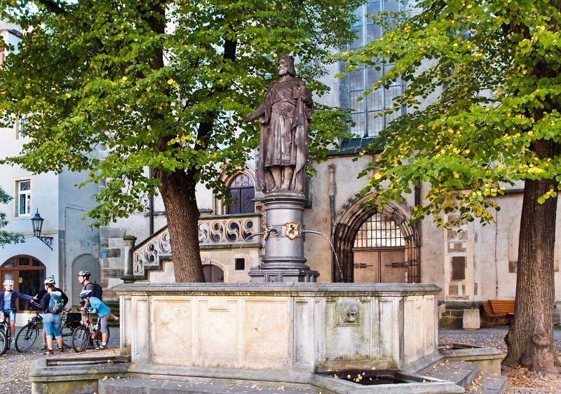 Der Heinrichsbrunnen wurde 1863 errichtet. Das von dem Dresdner Bildhauer Robert Henze (1827-1906) geschaffene Denkmal zeigt den König mit seiner Burggründung im Arm. Robert Henze schuf u. a. auch die bekannten vergoldeten Figuren auf dem Gebäude der Kunstakademie in Dresden.