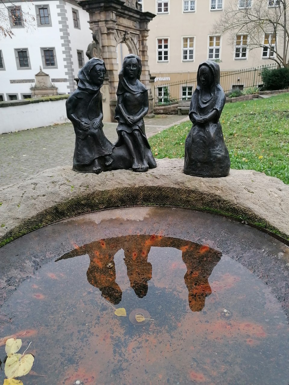Aber auch hier findet sich ein durch das Röhrfahrtsystem gespeister Brunnen. Die drei auf dem Brunnenrand befestigen Skulpturen lassen einen Bezug zur Frauenkirche vermuten, allerdings konnten wir leider bisher noch nichts weiter darüber herausfinden.