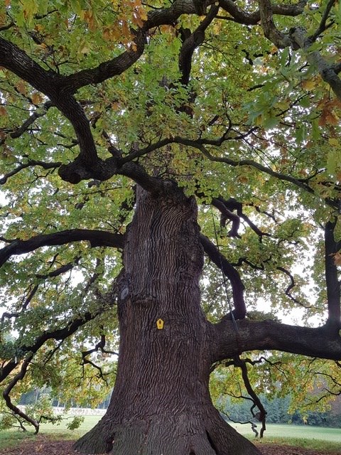 📝Rund um das Jagdschloss Graupa : Quercus robur ??Stage 2 of 5 Sequence: Random Ihr steht vor einer über 450 Jahre alten Stieleiche, die gut doppelt so alt werden kann. Eichen bilden eine kräftige Pfahlwurzel, durch diese sie sehr sturmfest sind.