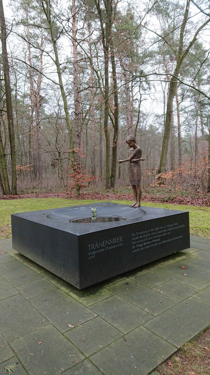 📝Heidefriedhof Dresden : TränenmeerStage 1 of 5 Sequence: Random Seit 2010 existiert die aus einer privaten Stiftung finanzierte Skulptur Trauerndes Mädchen am Tränenmeer, welche die in Dresden lebende polnische Künstlerin Malgorzata Chodakowska geschaffen hat. Die Skulptur eines Mädchens steht neben der Friedhofshalle vor einer großen schwarzen Marmorschale mit Blick auf den Ehrenhain und wurde zur Erinnerung an die Opfer des 13. und 14. Februar 1945 geschaffen.
