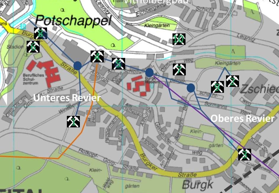 Zur Karte: Der Verlauf des Burgker Weißeritzstolln ist blau eingezeichnet. Die blauen Punkte sind Lichtlöcher.