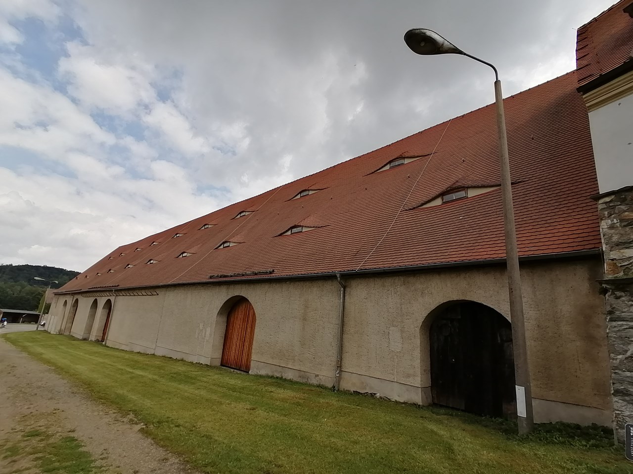📝Klosterpark ALTZELLA, das Erbe der Zisterzienser : Die Große Scheune und das FröhnerhausStage 3 of 5 Sequence: Random Im Zusammenhang mit der Errichtung des Kammergutes Zella wurde zwischen 1568 und 1570 die große Scheune erbaut, die man als Rinderstall, zeitweise auch als Kälberstall nutzte.