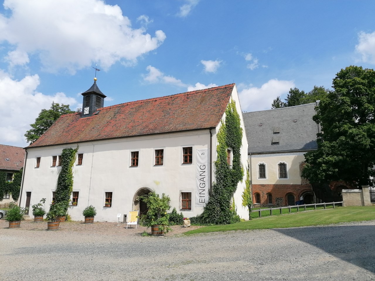 📝Klosterpark ALTZELLA, das Erbe der Zisterzienser : Die Schreiberei mit dem AbtshausportalStage 5 of 5 Sequence: Random Im Inventarium von 1540 wird das Gebäude als Schreiberei erwähnt. Nach dem Umbau in Folge eines Brandes 1599 diente es als Wohnung für den Pächter des Kammergutes. Ende des 18.Jahrhunderts wurde das Gebäude für die Käseherstellung und ab Anfang des 19.Jahrhunderts als Brandweinbrennerei genutzt. Anschließend diente es bis 1990 als Schmiede und Traktorenwerkstatt für das Volkseigene Gut (VEG). In den Jahren 1996-98 erfolgte der Umbau zum Servicegebäude. Dabei wurde der bauliche Zustand des 19.Jahrhunderts weitestgehend wieder hergestellt, spätere Anbauten wurden abgerissen und das alte Renaissanceportal des Roßweiner Abtshauses erhielt einen neuen würdigen Platz am Eingang des Hauses.