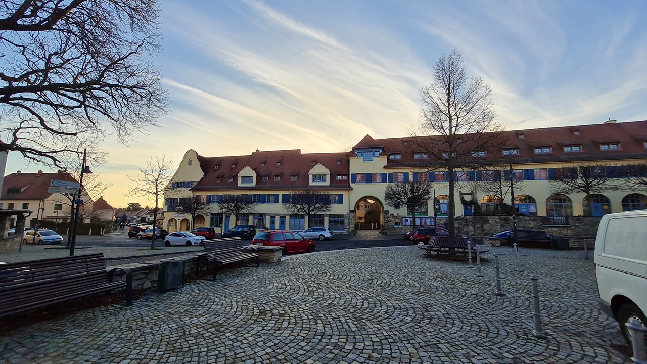 Den Markt prägt die leicht geschwungene Ladenzeile. Gegenüber wurden erst 1927-30 Mietwohnungen und Läden sowie das “Kaffee Hellerau” gebaut.
