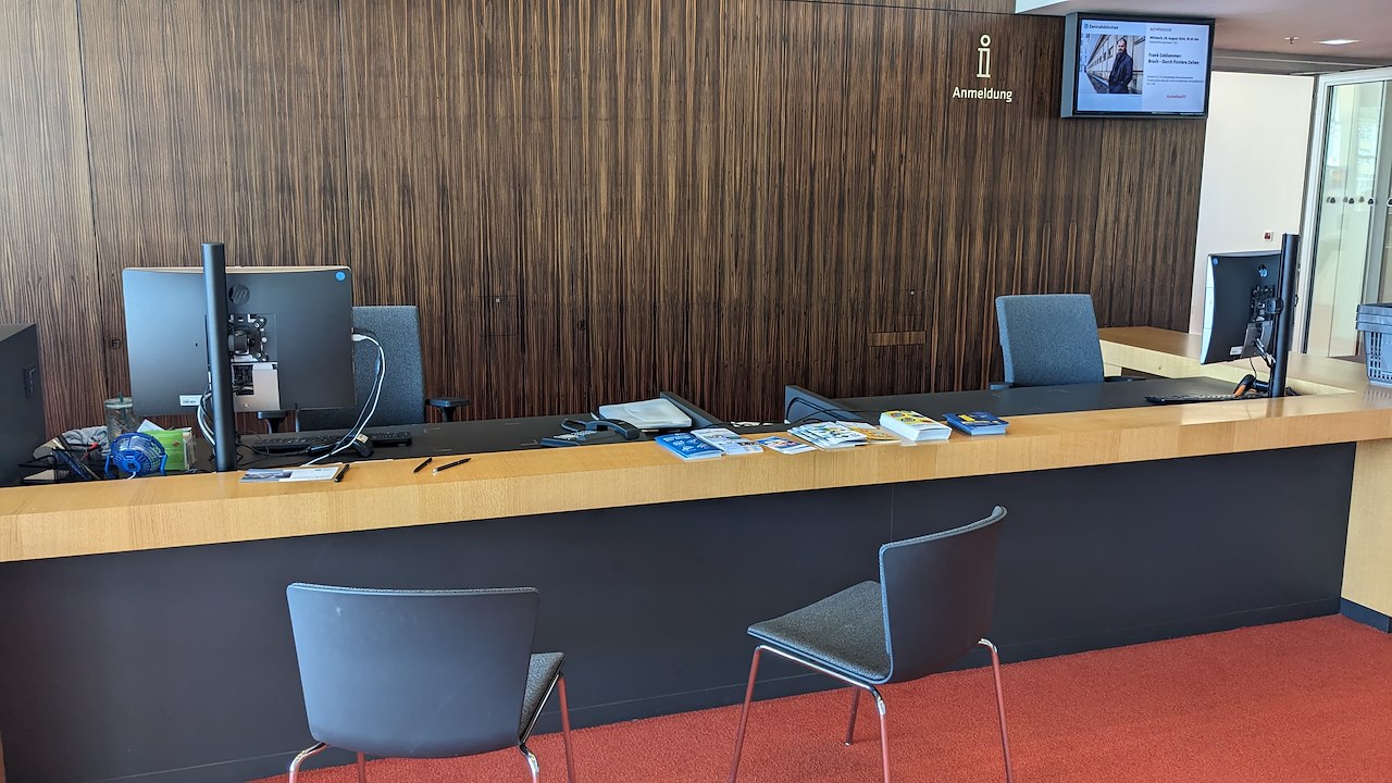 Das Foyer des 2. Obergeschosses ist gleichzeitig auch der Haupteingang, wo Bibliotheksnutzer und die die es werden wollen die wichtigsten Anlaufpunkte finden. Neben Kassenautomaten, Katalogen, Ausleih- und Rückgabestationen findet ihr hier auch zwei große Thekenbereiche. Begebt euch an die große Theke auf der Westseite.