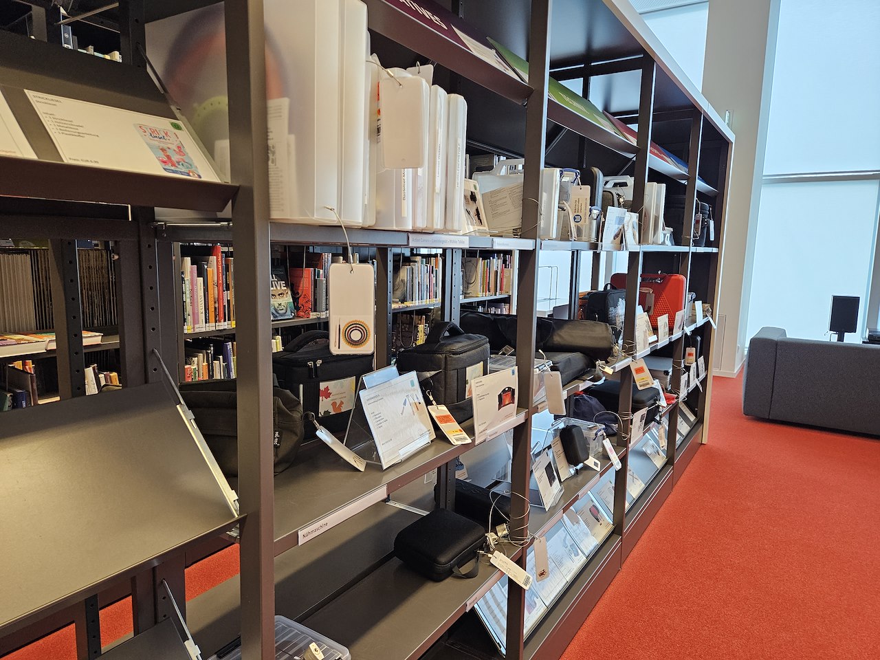 You will find the Library of Things behind the information desk of the Youth and Music Library. It connects the two areas, where there are items for playing and learning as well as instruments to try out. This special type of library was opened in 2021 and serves the purpose of sustainability, as some things, such as tools, may only be needed for a short period of time, thus avoiding an expensive purchase. Cachers can now also borrow a fishing rod or GPS device. Take a look around and browse through our catalog!