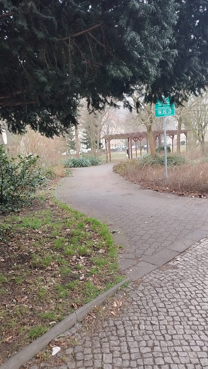 📝Geburtstag im Kollwitzpark : Standort 1: Ein EingangStage 1 of 5 Sequence: Random Hier ist ein Weg, um auf das Parkgelände zu gelangen.