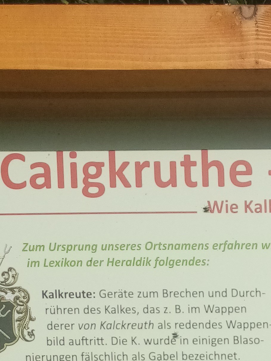 📝Kalkreuther Spaziergang : OrtsnameStage 1 of 5 Sequence: Random Die Familie von Kalkreuth waren Kalkbrenner und hatten die "Kalkreute" (Gräte zum Brechen und Durchrühren des Kalkes) im Familienwappen.