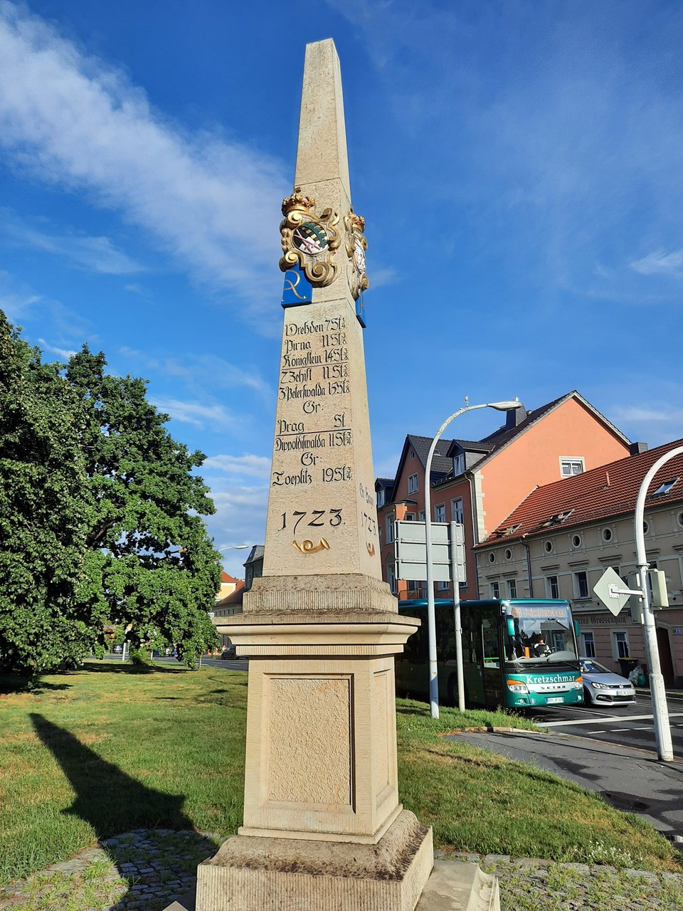 📝Bummel durch Großenhain : PostmeilensäuleStage 2 of 5 Sequence: Random Eine kursächsische Postmeilensäule, umgangssprachlich auch sächsische Postmeilensäule oder nur Postsäule genannt, ist ein Meilenstein, der Entfernungen und Gehzeiten bis auf eine Achtelstunde genau angibt.