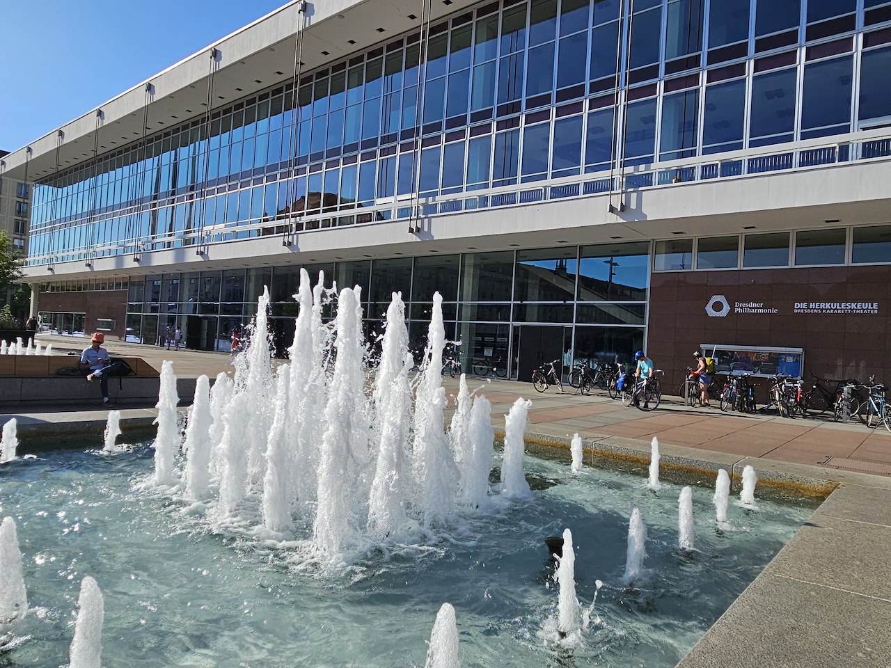 📝Kulturpalast Dresden : BrunnenStage 5 of 10 Sequence: Random Vor dem Kulturpalast laden drei Brunnen zum Verweilen ein. Im Zuge der Sanierung des Gebäudes wurden 2017 auch die drei Wasserbecken auf dem Vorplatz mit den Maßen 7,33 x 7,33 Meter nahezu originalgetreu wiederhergestellt. Ein besonderes Highlight sind die 52 LED-Unterwasser-Scheinwerfer, die am Abend die Fontänen in Rot, Grün, Blau, Weiß und Amber erstrahlen lassen.