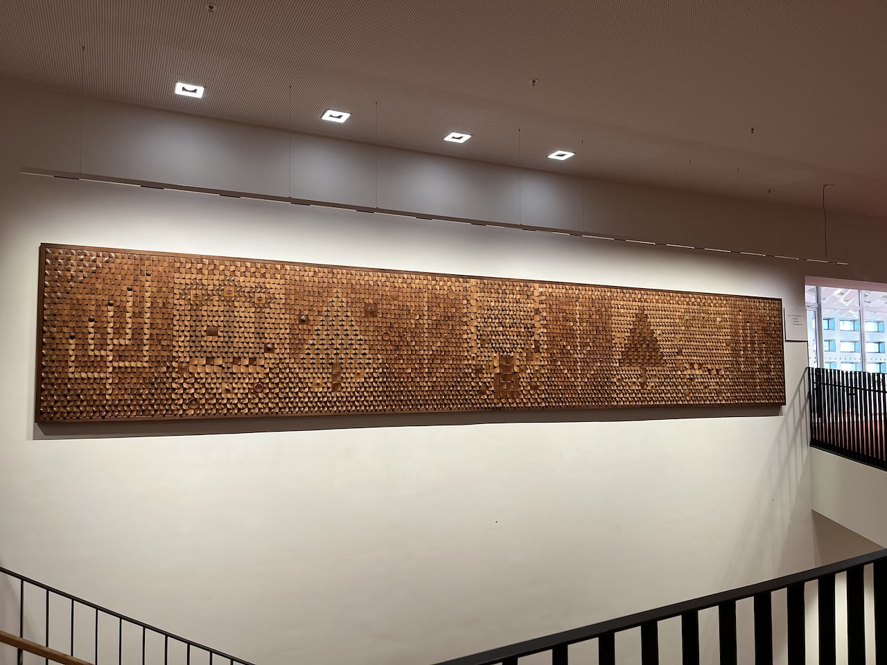 Im 2. Obergeschoss findet ihr zwischen dem Bereich "Musik" und dem Lesesaal ein imposantes Holzkunstwerk von Lüder Baier. Der Künstler schuf den 9,5 Meter langen und 1,5 Meter hohen Fries 1968/1969 für die Gaststätte des Kulturpalastes, die es so heute nicht mehr gibt. Die Wandfläche besteht aus neun zusammengesetzten Einzeltafeln, die das vorgegebene Thema "Folkloristische Traditionen" in einer sehr freien Interpretation zeigen. Lüder Baier schuf eine Landschaft mit Bäumen aus quadratischen, sich wiederholenden Grundelementen, die durch zugespitzte Schwünge und kreiselartige Einzelelemente ergänzt wurden. Durch die Verwendung von Lärchen- und Edelhölzern sowie die Drehung und Wiederholung einzelner Teile entsteht ein reliefartiges Strukturbild. Schaut doch einmal genauer auf das Täfelchen links vom Holzfries.