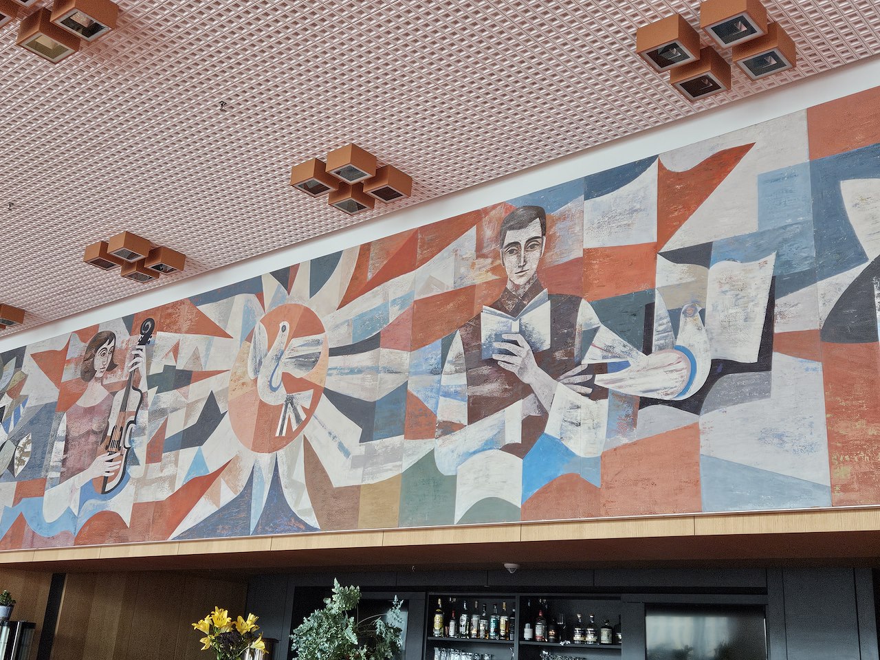 In the foyer on the second floor, there is another mural above the entrances to the main hall. "Our Socialist Life" by Heinz Drache and Walter Rehn is also a chronological depiction of contemporary history, starting with the reconstruction of the destroyed city of Dresden after the Second World War and ending with the conquest of space.