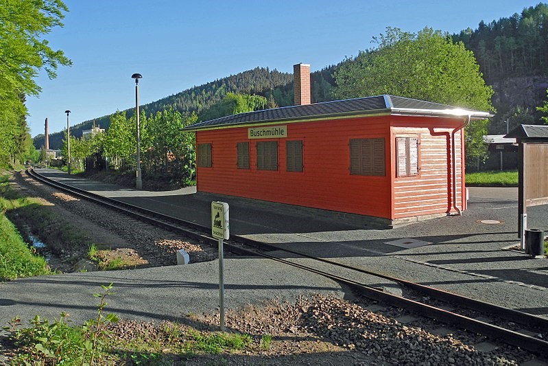 📝Dampfnostalgie 2 : Haltepunkt Buschmühle Stage 2 of 5 Sequence: Random Der Haltepunkt Buschmühle (Km 23,3 / 469 m ü. NN) besteht seit der Eröffnung der Strecke. Bis Anfang der 1990er Jahre endeten hier die Güterzüge zur Bedienung der Gießerei Schmiedeberg. Um die Lokomotive nach der Anschlussbedienung umsetzen zu können, wurde noch 1988 das ehemalige Ladegleis der Haltestelle erneuert.