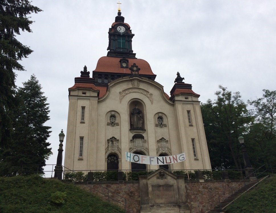 📝Das Jagdschloss zu Moritzburg : Kirche MoritzburgStage 1 of 5 Sequence: Random Das damalige Dorf Eisenberg erhielt erst nach 1900 eine eigene Kirche. Zuvor gehörte Eisenberg zur Gemeinde Reichenberg. Durch Stiftungen und Sammlungen konnte 1902 die Errichtung einer eigenen Kirche in Angriff genommen werden. Die barocke Form wurde gewählt um einen Einklang mit der barocken Form des Jagdschlosses zu erhalten. Die Einweihung erfolgte 1904.