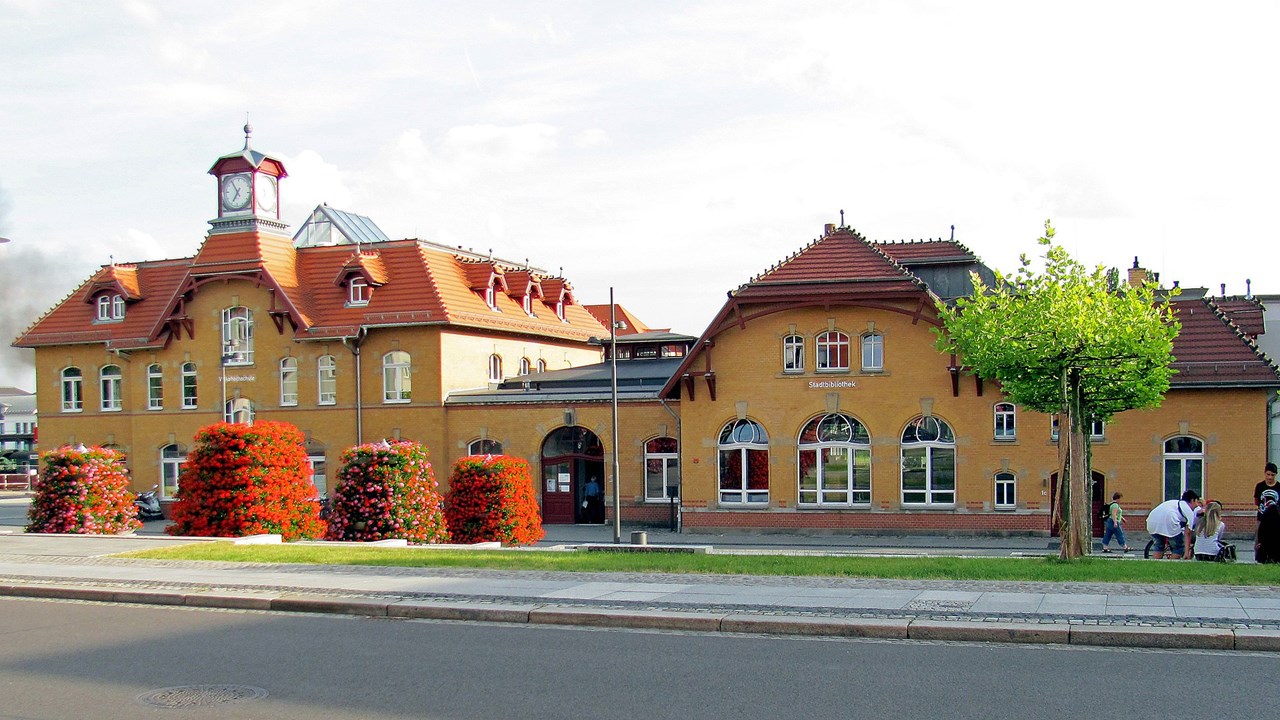Hier beginnt die "Lößnitzgrundbahn". Ursprünglich eröffnte wurde der "Bahnhof Radebeul" bereits 1860 für die Ferneisenbahnverbindung Leipzig–Dresden. Erst am 5.5.1941 erhielt der Bahnhof den Namen Radebeul Ost. Das ehemalige Empfangsgebäude ist ein markanter Ziegelbau aus zwei zweigeschossigen Gebäudekörpern mit einem eingeschossigen Verbindungsbau. Im Verbindungsbau mit dem rundbogigen Haupteingang befand sich die Schalterhalle. Der westliche Gebäudeteil enthielt den Wartesaal. Der Bahnhof wurde 2002 saniert und komplett von Eisenbahnaufgaben entwidmet, dabei wurde in den Wartesaal die Stadtbibliothek Radebeul-Ost verlegt und seit 2013 ist im Ostbau die Volkshochschule untergebracht. Der Historische Güterboden wurde zum Schmalspurbahnmuseum Radebeul umgebaut. Funktional gliedert sich das Bahnhofsareal heute in den modernisierten Haltepunkt für die S-Bahn sowie den denkmalgeschützten Ausgangsbahnhof der "Lößnitzgrundbahn".